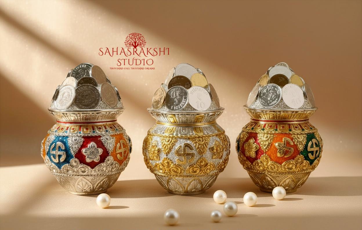 Adorned with intricate detailing, enamel accents, and embossed motifs, each kalash represents the eternal cycle of wealth, purity, and protection. The coin-filled top signifies uninterrupted fortune and positive energy.